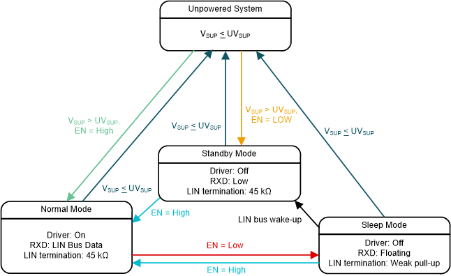 The TLIN2024A-Q1 has three functional modes of operation, normal, sleep, and standby. The next sections describe these modes as well as how the device moves between the different modes. Figure 9-4 graphically shows the relationship while Table 9-1 shows the state of pins.