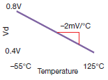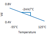 Fairly linear slope ≈ –2mV/CSlope varies according to current excitation, diode type, and diode processing |