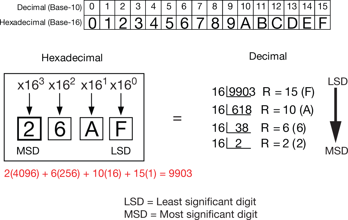 Example conversion: Hexadecimal to decimal and decimal to hexadecimal