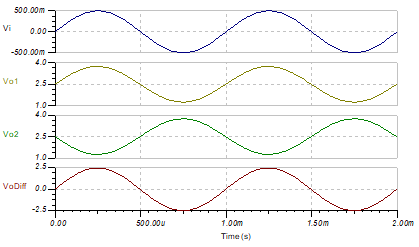 此電路使用兩個(gè)運(yùn)算放大器構(gòu)建分立式單電源差分輸入差分輸出放大器。電路將差分信號(hào)轉(zhuǎn)換為差分輸出信號(hào)。