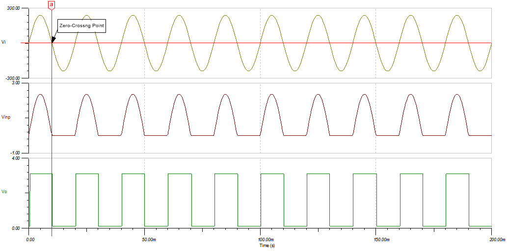 當交流輸入超過零基準電壓時,過零檢測器電路會改變比較器的輸出狀態(tài)。這是通過將比較器反相輸入設置為零基準電壓,并將衰減輸入施加到同相輸入來實完成的。分壓器 R1 和 R2 會使輸入交流信號衰減。二極管 D1 用于確保同相輸入永遠不會低于比較器的負輸入共模限值。過零檢測通常用于電源控制電路。