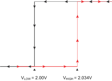 - 計(jì)算 VHIGH,這是欠壓警報(bào)信號(hào)取消置位(恢復(fù)至邏輯高電平值)時(shí)的電池電壓。如果電池電壓降至 2.0V 以下或在初始啟動(dòng)時(shí)升高,則比較器輸入需要超過(guò) (VIT+),這是使輸出恢復(fù)至邏輯高電平的正向輸入閾值電壓。TLV4021R1 數(shù)據(jù)表中的 VIT+ 為 1.20V。