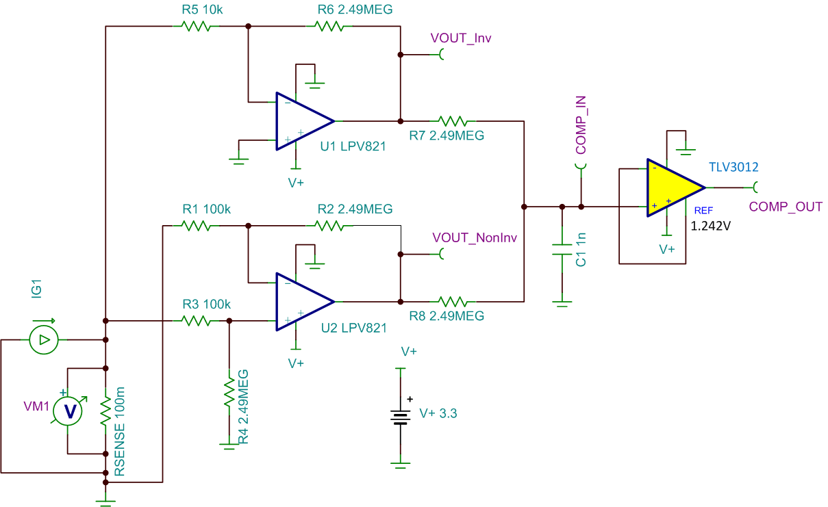 如果系統(tǒng)中已有穩(wěn)壓電源或基準(zhǔn),可以用毫微功耗比較器(例如 TLV7031)來代替 TLV3012。而且,如果充電電流和系統(tǒng)電流的幅度相等,可以將放大器 U1 和 U2 的增益設(shè)為彼此相等。即使放大器的增益相等,對(duì)放大器輸出進(jìn)行或運(yùn)算也可以讓一個(gè)比較器檢測(cè)充電電流和系統(tǒng)電流的過流情況。