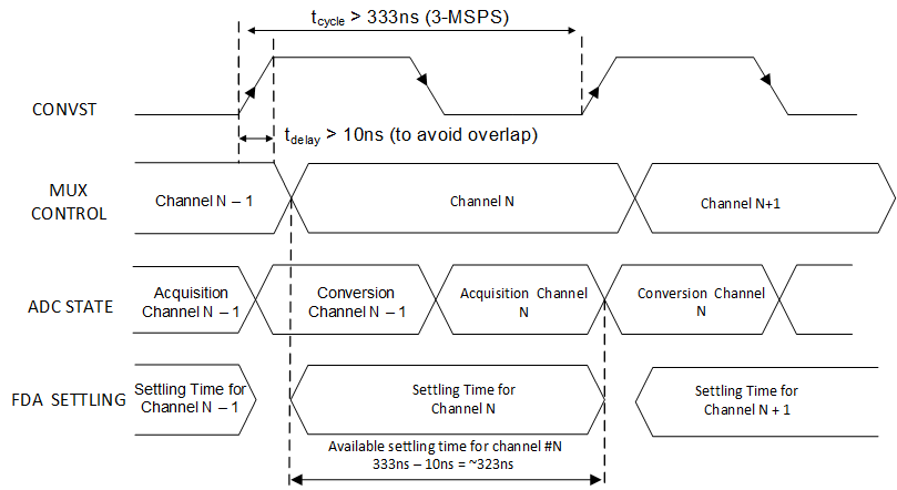 下圖顯示了 ADC 轉(zhuǎn)換控制 (CONVST) 和多路復(fù)用器通道控制時(shí)序。ADS9224R 支持 3Msps 的最大采樣速率或 333ns 的最短周期時(shí)間。為了避免在 CONVST 信號的上升沿之前切換通道,在 CONVST 上升沿之后的多路復(fù)用器通道控制時(shí)序中實(shí)現(xiàn)了短暫的延遲。有關(guān)該主題的詳細(xì)理論,請參閱 TI 設(shè)計(jì)適用于高電壓輸入的 16 位、400kSPS、四通道多路復(fù)用器數(shù)據(jù)采集系統(tǒng)參考設(shè)計(jì)。