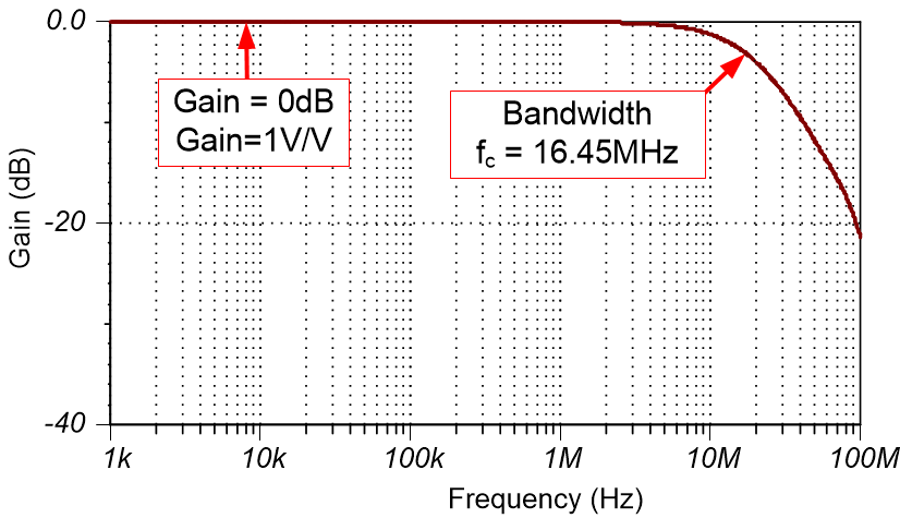 該電路具有 0dB (1V/V) 的增益和 16.45MHz 的仿真頻率帶寬。請注意,計(jì)算的帶寬和仿真的帶寬非常接近(計(jì)算值 = 17.62MHz,仿真值 = 16.45MHz)。有關(guān)帶寬計(jì)算和仿真的總體概述,請觀看運(yùn)算放大器帶寬。