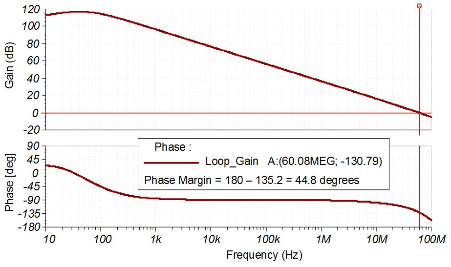 在 TINA 中使用以下電路來測量環(huán)路增益并在 TINA 中使用交流分析來驗(yàn)證相位裕度。在反饋環(huán)路中使用電阻器 RISO = 10? 來增大相位裕度。該電路具有良好的穩(wěn)定性(大約 45 度的相位裕度)。請觀看運(yùn)算放大器穩(wěn)定性,以了解有關(guān)該主題的詳細(xì)理論。