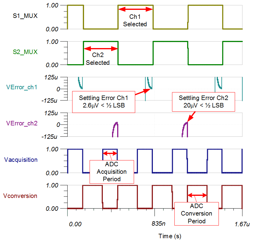 以下 TINA 瞬態(tài)仿真顯示了在相鄰多路復(fù)用器通道之間發(fā)生滿量程階躍變化后 FDA、多路復(fù)用器和 SAR ADC 采樣保持的穩(wěn)定。該類型的仿真表明已正確選擇采樣保持反沖電路和 AFE 放大器電路。請參閱 SAR ADC 前端元件選擇簡介,了解如何選擇 RC 濾波器以實(shí)現(xiàn)出色的穩(wěn)定和交流性能。