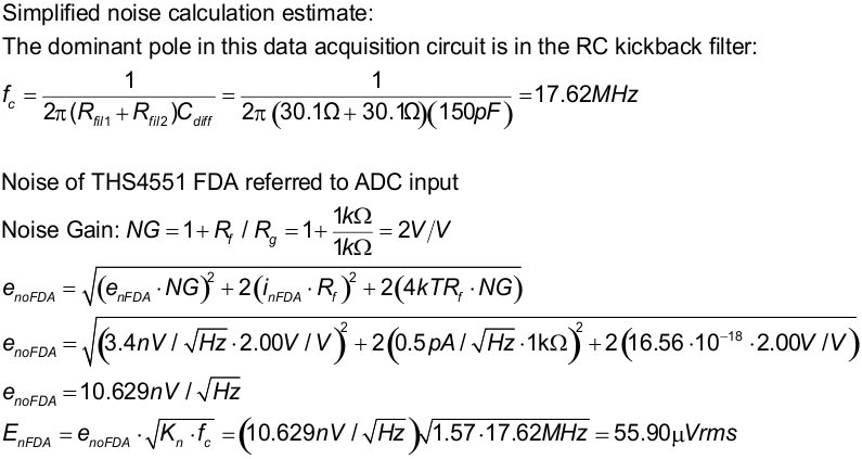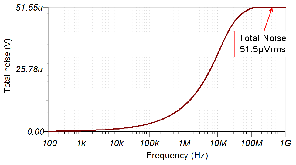 下圖顯示了 FDA 電路的 TINA 仿真總噪聲。請參閱計(jì)算 ADC 系統(tǒng)的總噪聲,了解有關(guān)此主題的詳細(xì)理論。請注意,計(jì)算的噪聲和仿真的噪聲非常接近(計(jì)算值 = 55.9μVrms,仿真值 = 51.5μVrms)。