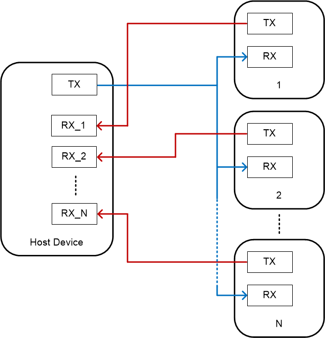 一種可以解決鏈路斷開問題并減小器件間延遲的通信拓?fù)涫切切屯負(fù)?,其中多個(gè)節(jié)點(diǎn)直接連接到一個(gè)中央主機(jī)器件。#T5807283-18 顯示了具有 N (N≥2) 個(gè)節(jié)點(diǎn)器件的星型拓?fù)湎到y(tǒng)。