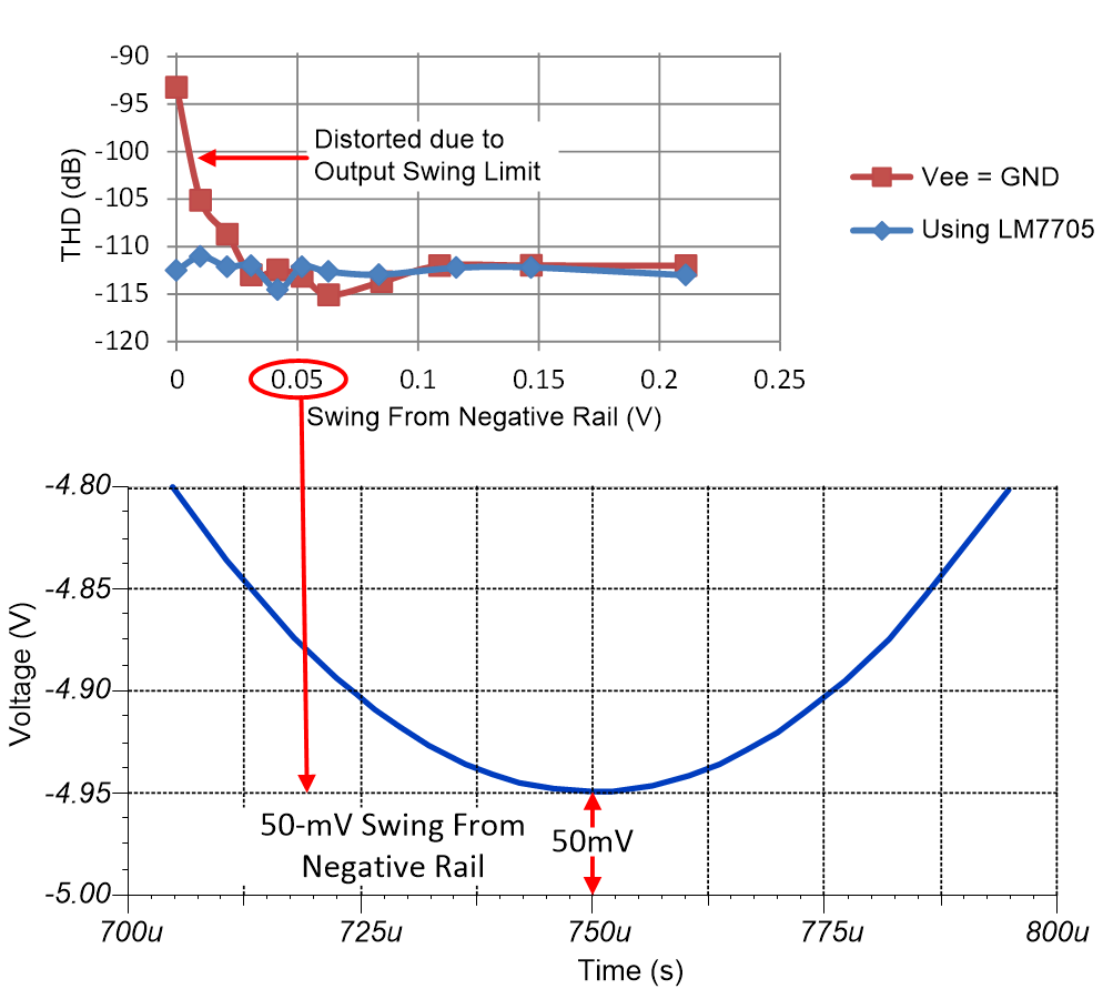 下圖展示了使用 –0.232V 負(fù)電源 (LM7705) 和接地負(fù)電源時(shí),測(cè)得的 OPA320 運(yùn)算放大器(驅(qū)動(dòng) ADS8860 SAR ADC)的 THD。該曲線顯示,使用 0V 負(fù)電源時(shí),放大器輸出擺動(dòng)至距離電源軌小于 50mV 時(shí)出現(xiàn)失真,而使用 –0.232V 電源時(shí),放大器輸出未出現(xiàn)失真。