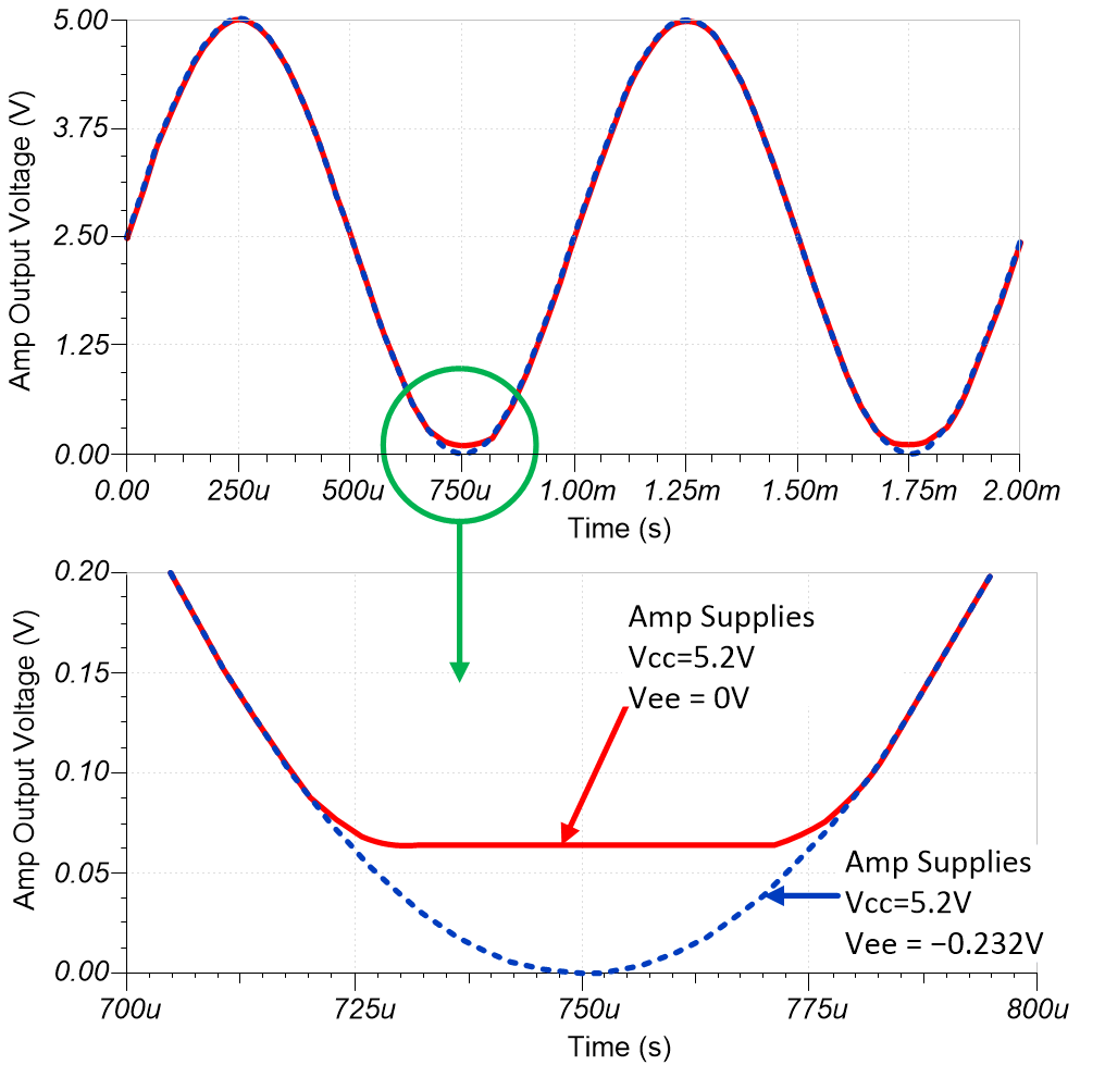 下圖顯示了當(dāng)正弦波形接近接地時(shí),輸出擺幅限制如何使其出現(xiàn)失真或削波。在本示例中,向運(yùn)算放大器的輸入端施加 5Vpp 信號(hào),且負(fù)電源連接到 GND 和 –0.232V。正電源連接到 5.2V,因此正電源沒有輸出擺幅限制。請(qǐng)注意,使用接地負(fù)電源的放大器的輸出信號(hào)在接近接地時(shí)出現(xiàn)失真,而使用 –0.232V 負(fù)電源的放大器在接近接地時(shí)未出現(xiàn)失真。