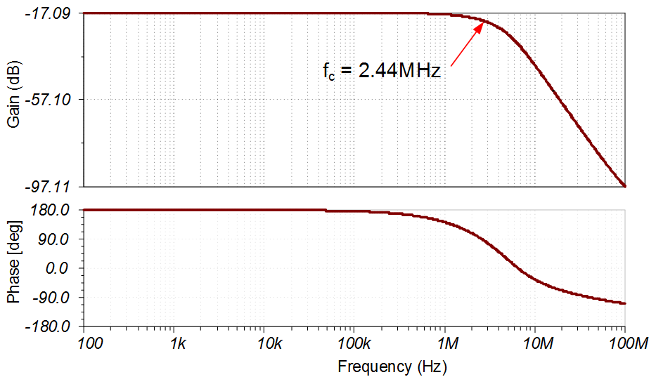 帶寬受限于 Cf × Rf 濾波器 (fc1 = 3.39MHz) 和輸出濾波器 (fc1 = 4.92MHz)。這兩個極點組合形成一個二階濾波器,其仿真的截止頻率為 2.44MHz。有關該主題的更多詳細信息,請觀看運算放大器帶寬 視頻系列。