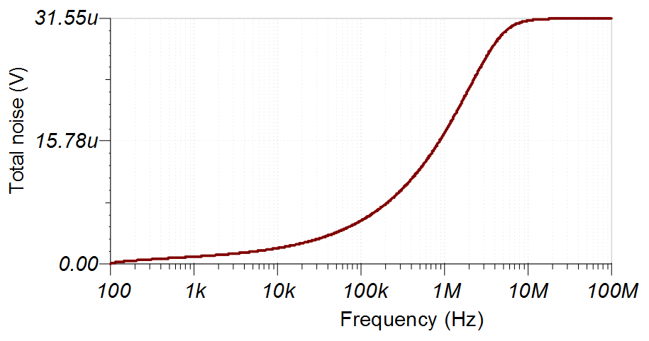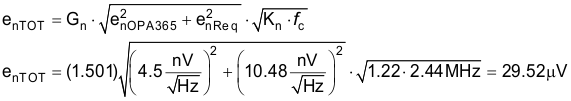 以下噪聲計算考慮了電阻器網(wǎng)絡的熱噪聲、放大器噪聲以及濾波器的帶寬限制。計算得出的總噪聲為 29.52μV,仿真得到的總噪聲為 31.55μV。有關放大器噪聲計算的詳細理論,請參閱運算放大器噪聲計算 視頻;有關數(shù)據(jù)轉換器噪聲,請參閱計算 ADC 系統(tǒng)的總噪聲 視頻。