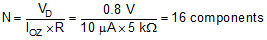 圖 6-2 獨立總線保持電路 (SN74ACT107x)假設(shè)在實際應(yīng)用中,總線上驅(qū)動器的泄漏電流為 IOZ = 10mA,5kΩ 電阻兩端的壓降為 VD = 0.8V(假設(shè)此值是為了確保達到定義的邏輯電平)。然后,一個總線保持電路能夠處理的最大元件數(shù)量可通過 方程式 6 計算: