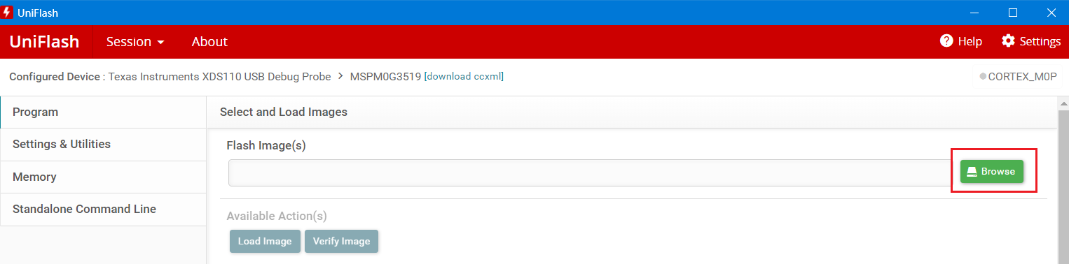 圖 3-2 UniFlash 燒錄 Firmware 工程界面在下圖界面點(diǎn)擊 Browse 按鈕,選擇 G3519-MCF8315.out 文件。